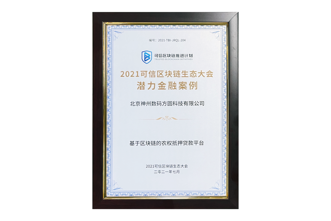 7月13日,由中国信息通信研究院、可信区块链推进计划主办的“2021可信区块链生态大会”在京举办,并隆重发布系列成果。BB贝博艾弗森官网子公司北京bb贝博艾弗森方圆科技有限公司(简称:神州方圆)推荐的“基于区块链的农权抵押贷款平台”荣获十大金融应用高潜力案例,为“区块链+农业”落地带来示范效应。