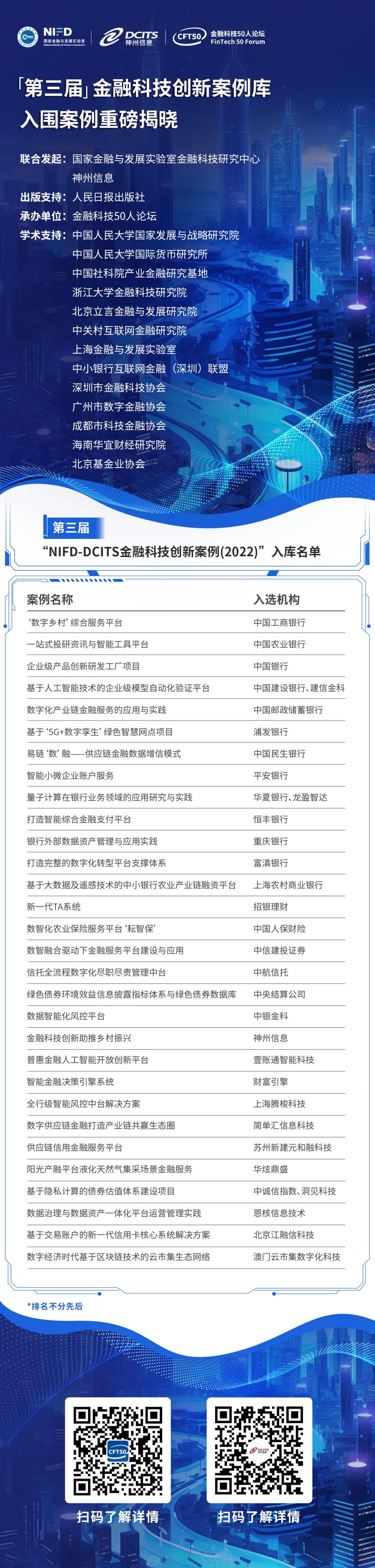 本届入库的30个案例,收录于《数实融合:金融科技创新实践》一书中,已由人民日报出版社发行。我们真诚地向为本书顺利出版提供过指导与帮助的专家和机构致谢,未来期待更多的金融科技生态伙伴参与到案例编写工作中。“NIFD-DCITS全球金融科技创新案例库”旨在建设成为国内外顶尖的金融科技创新案例聚合基地,不仅为政府、监管、金融机构和企业提供重要参考素材,还将为国内外院校的教学、研究提供鲜活资料,有效服务于我国金融科技的健康发展,并且向国际社会充分展示我国优秀金融科技企业的风貌。