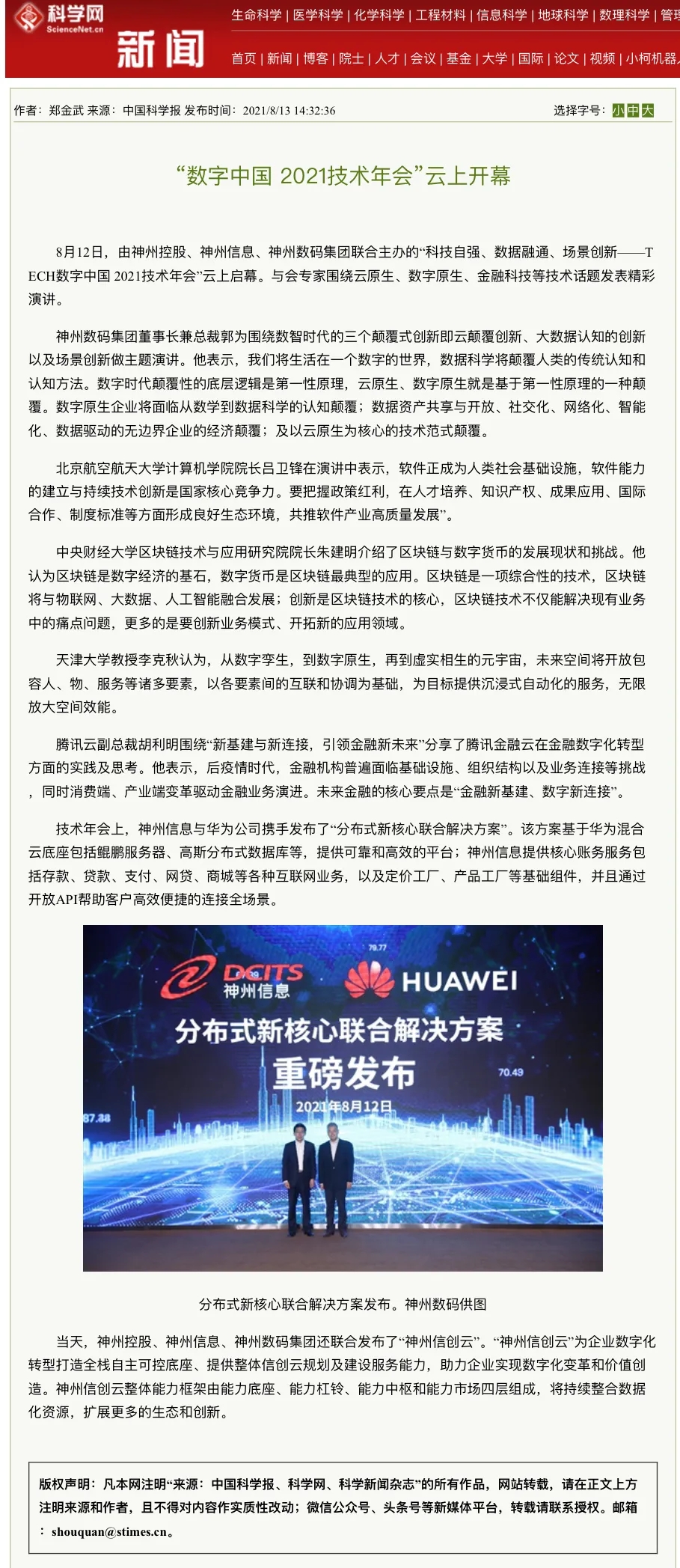 “数字中国 2021技术年会”云上举行 神州控股等联合发布 “神州信创云”