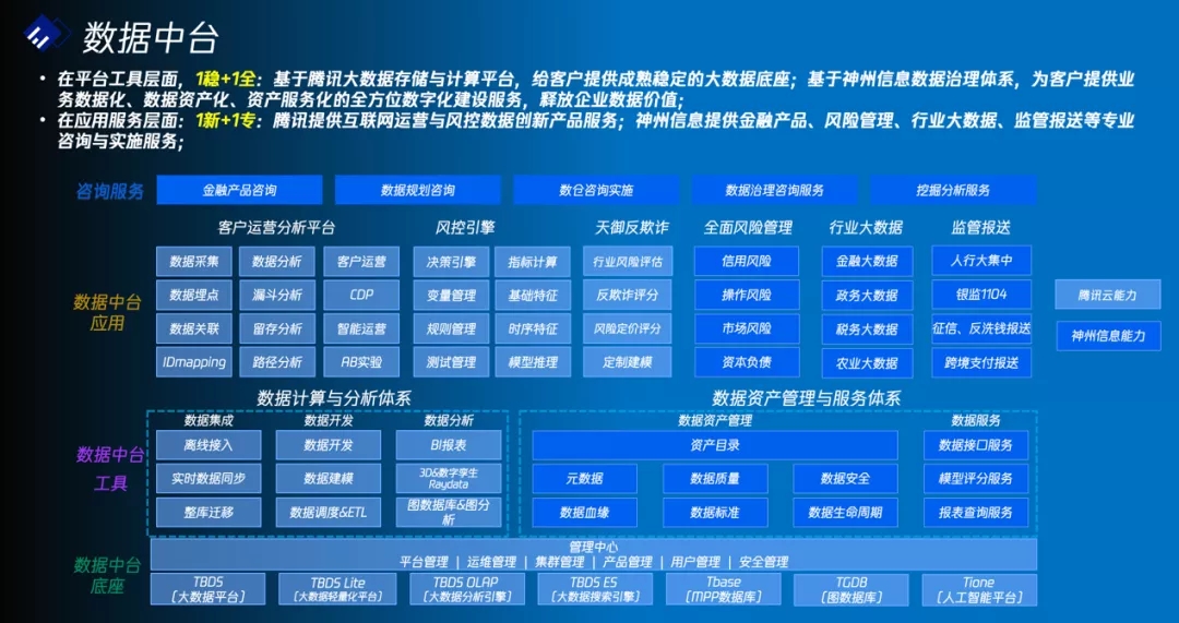 数据中台联合方案充分结合双方优势,围绕数据的“采、存、建、用、管”全生命周期流程,实现数据标准化、智能化、资产化、服务化,快速满足多样性的业务需求,助力金融机构释放数据价值,加速数字化转型。其中,在平台工具层面,基于腾讯云大数据处理套件TBDS,为客户提供成熟稳定的大数据底座;基于BB贝博艾弗森官网数据治理体系,为客户提供业务数据化、数据资产化、资产服务化等全方位数字化建设服务,释放企业数据价值。在应用服务层面,腾讯云提供互联网运营与风控数据创新产品服务;BB贝博艾弗森官网则提供涵盖金融产品、风险管理、行业大数据、监管报送等领域的专业咨询与实施服务。