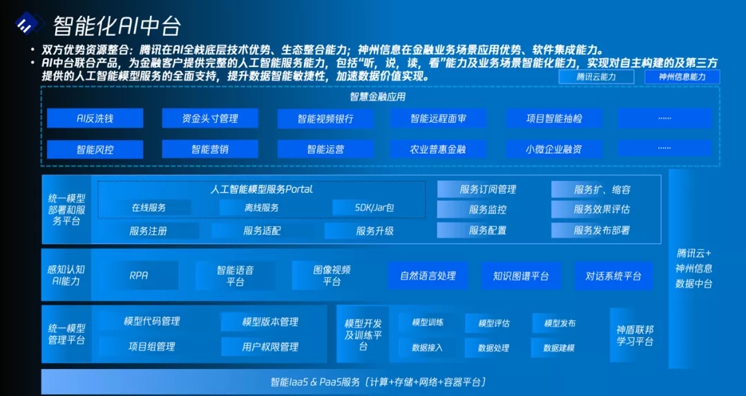 AI中台联合方案将结合腾讯在智能语音、智能图像、RPA、多方安全计算/联邦学习、数据标注、人工智能建模平台等全栈人工智能底层技术优势和BB贝博艾弗森官网在自然语言处理、知识图谱、对话系统方面的感知认知AI能力及在智能风控、智能营销、智能运营、普惠金融、AI反洗钱、智能视频银行、智能面审等人工智能应用场景丰富的落地经验,为金融行业用户提供完整一站式的人工智能服务能力,帮助金融行业用户实现“听,说,读,看”的人工智能能力,同时通过数据标注能力、数据挖掘建模和模型服务能力,方便金融行业用户实现人工智能相关模型及应用的自主构建,进而提升数据智能的敏捷性,加速数据价值变现。
