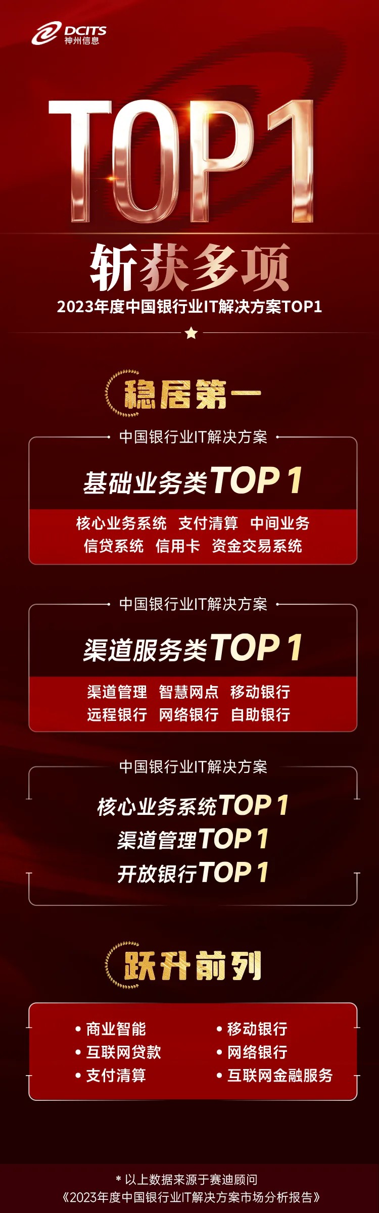 蝉联核心业务系统解决方案市场Top1。在基础业务类解决方案中,核心业务系统依然是最大的子市场,围绕自主创新的改造升级成为核心业务系统的主旋律,是银行的重中之重。